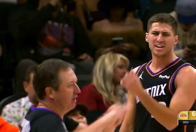 次节回来,古德温接球三分命中后伊戈达罗急停跳投再中,太阳领先到8分。艾顿转身干拔中距离得手,接着抢断后快下完成双手暴扣,斯马特送出纵贯全场的精准长传,助攻詹姆斯碾进内线轻松打进,湖人一波流将分差缩小至2分,打停太阳。奥尼尔三分再中止血,詹姆斯持球险些被抢断,自己拿住球飞身上篮命中,狄龙与拉拉维亚倒地拼抢地板球,湖人最后喊下暂停拿到球权。詹姆斯进攻中撞倒狄龙,裁判吹罚进攻犯规,回看后并没有升级,布克迎着东契奇上演高难度后仰中投,命中后还有加罚,东契奇连续失误,狄龙反击一条龙打进,太阳重新领先到8分。八村塁接球三分止血,詹姆斯连续造犯规走上罚球线,半场战罢,湖人62-62追平太阳。
